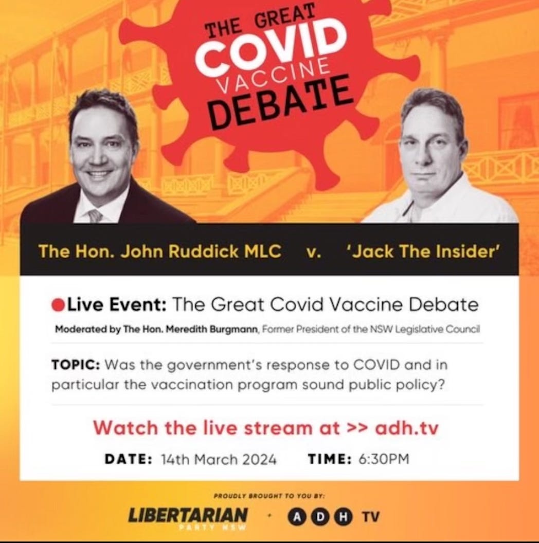But the Hon. John Ruddick MLC has arranged the first ever Australian debate at NSW Parliament House on COVID which will air live on ADH TV on Thursday 14th March at 6:30pm. Go to ADH.TV/live to watch on your computer, tablet or phone. Don’t miss it!